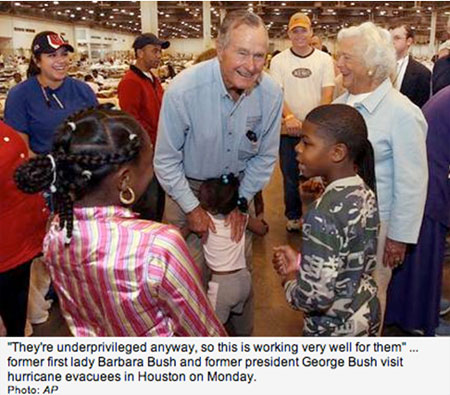 Perhaps the most telling aspect of class indifference came when Barbara Bush, the President’s mother, made the following comment about the thousands of dispossessed New Orleans evacuees who found shelter in Houston’s Astrodome:
